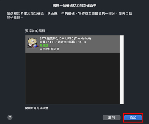 4. 點選陣列磁碟,選擇 [添加磁碟…] ,選擇要加入的磁碟。